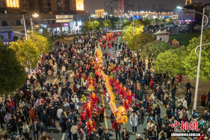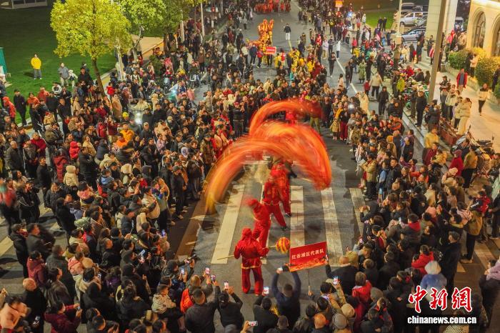 3月2日,元宵节前夜,“龙腾狮跃”迎献岁巡回举动正在江东北昌湾里办理局举办,夜色当中,1条条龙灯、板灯龙翩翩起舞,采莲舟、牙婆、蚌壳粗、渔人、浮薄花篮、北狮、扇子舞等习惯轮流演出,吸收了浩繁公众沿街旁观。图为巡行现场,出色的上演吸收浩繁公众沿街旁观。(无人机像片)中新社记者 刘力鑫 摄