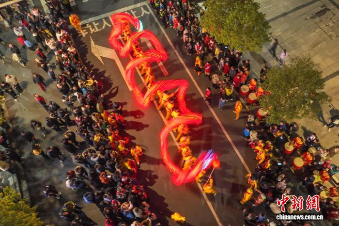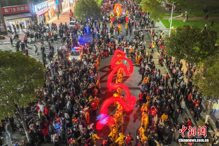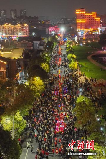 3月2日,元宵节前夜,“龙腾狮跃”迎献岁巡回举动正在江东北昌湾里办理局举办,夜色当中,1条条龙灯、板灯龙翩翩起舞,采莲舟、牙婆、蚌壳粗、渔人、浮薄花篮、北狮、扇子舞等习惯轮流演出,吸收了浩繁公众沿街旁观。图为巡行现场,出色的上演吸收浩繁公众沿街旁观。(无人机像片)中新社记者 刘力鑫 摄